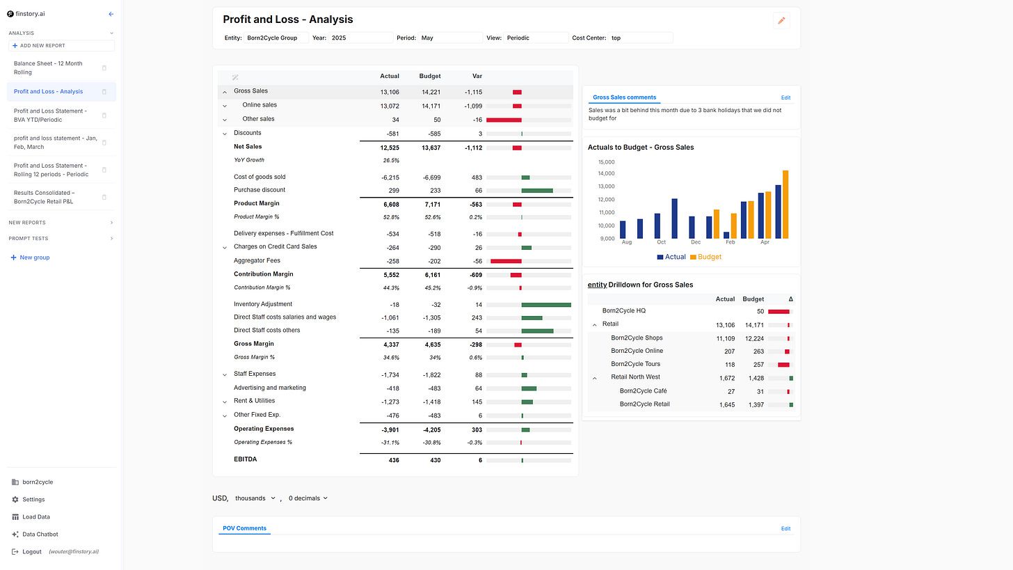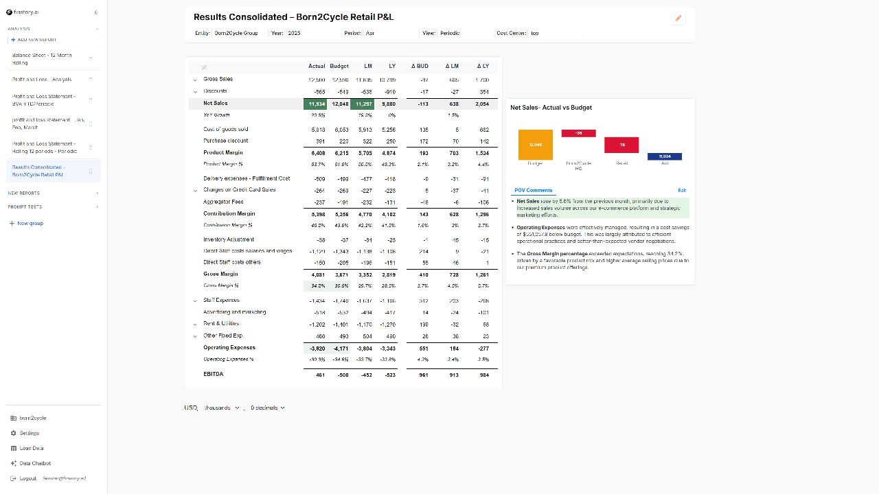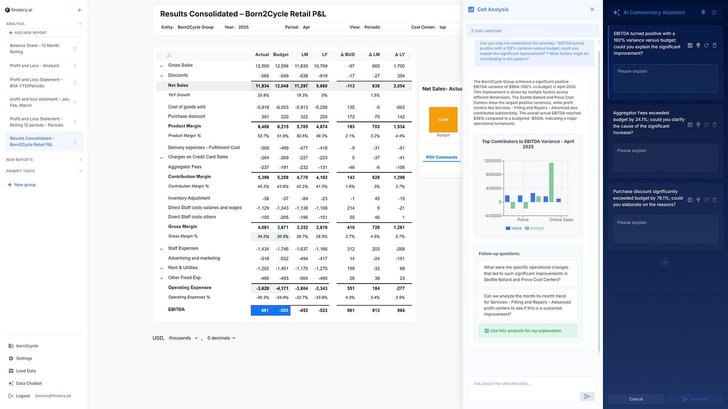 finstory handles layouts, charts, variance analysis, and narrative creation automatically